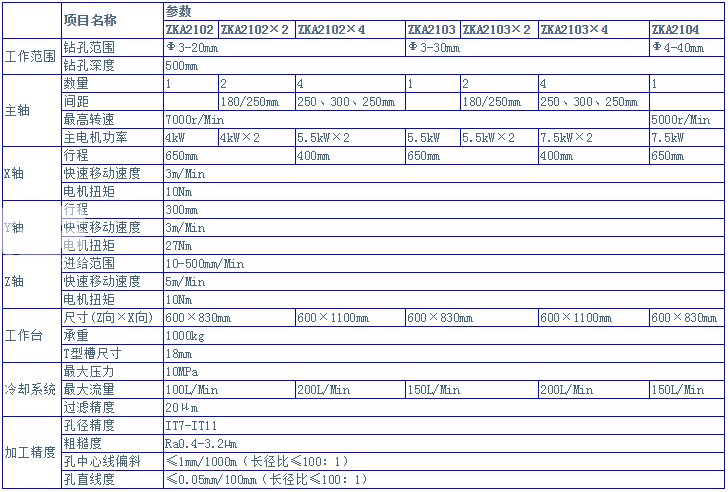 ZKA21系三坐標(biāo)數(shù)控深孔鉆機(jī)床采用槍鉆加工方式(外排屑),刀具旋轉(zhuǎn)進(jìn)給,工件固定在工作臺上,工作臺可以垂直和橫向移動;采用進(jìn)口或國產(chǎn)的數(shù)控系統(tǒng),具有單動和自動循環(huán)功能,三個伺服軸:X軸、Y軸、Z軸,采用伺服電機(jī)驅(qū)動滾珠絲杠副實現(xiàn)各軸的移動;刀具轉(zhuǎn)速和進(jìn)給量均為無級調(diào)速。******鉆孔直徑是20mm、30mm、40mm三種規(guī)格。具有鉆削直孔、斜孔、盲孔和階梯孔的功能。廣泛應(yīng)用于汽車、摩托車行業(yè)、模具行業(yè)、軍工行業(yè)、航天工業(yè)、液壓閥體、齒輪軸類等零件的小深孔加工。
