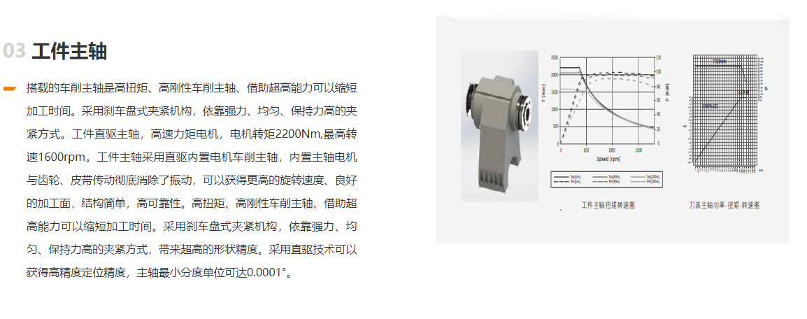 工件主軸采用橫跨式結構,便于中心架移動到卡盤左端,工件主軸采用直驅方式,最高轉速1600rpm;