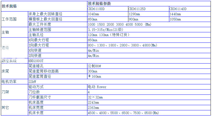 CKD611XXD系列型數(shù)控車床是本廠自行研制開發(fā)的數(shù)控車床,為大規(guī)格數(shù)控車床產(chǎn)品中的精品。高效率、高穩(wěn)定性、高精度、高通用性、高剛性等一系列機(jī)床優(yōu)良品質(zhì)均體現(xiàn)在CKD611XXD系列數(shù)控機(jī)床的設(shè)計(jì)和制造中。床身采用平-V導(dǎo)軌,經(jīng)過中頻淬火和精密磨削,剛性高,可承受重載精密切削。機(jī)床配置KND2000T控制系統(tǒng)和伺服進(jìn)給電機(jī),功能完善,性能可靠。選用國內(nèi)******滾珠絲杠,精度好,效率高。